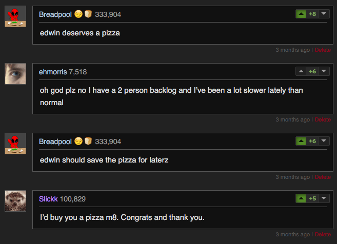 I have successfully seeded the Genius community. The process of getting this pizza was amazing — I didn’t have to do anything. I rolled out a few upgrades to the chat feature on Genius, and in the announcement thread, ScopeY said “edwin deserves a pizza”, Slick said “I’d buy you a pizza m8”, night pool pasted the link to this website, and then Slick actually bought me the pizza.