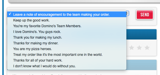 As another first tonight I created my Domino’s pizza profile. Turns out I could have been getting even more free pizza this entire time. When I ordered I noticed a new drop-down menu (which is not new at all) below the Pizza Tracker which I love so much — it was the “encouragement menu”, which contained a list of some nice and some slightly strange sentences that somehow get broadcast to the people making your pizza — the future is amazing.
