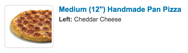 I am still customizing the pizza. Jillian thinks a cheddar topping will be gross but i disagree, so I’m getting it on half (post-eating note: it was great.) I’m on the checkout screen now and even though I just went through a whole pizza customization thing, they’re showing me a generic thumbnail image for my pizza order, and it has pepperoni on it! Why.